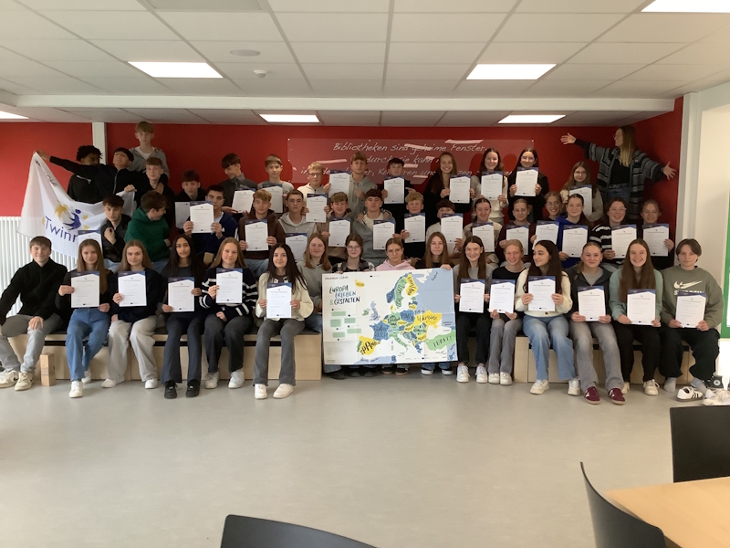 Videos drehen, digitale Avatare gestalten, nach dem regulären Unterricht länger bleiben um die Austauschschülerinnen und -schüler per Videokonferenz näher kennenzulernen – das alles hat sich für die Klassen 9b und 9c im letzten Schuljahr 2024/2025 gelohnt: Für ihr mehrsprachiges, digitales Austauschprojekt mit einer französischen Schulklasse des Collège François Villon in Saint-Varent mit dem Titel „Eins-deux-three-cuatro: Environmental Friendship between France and Germany“ haben die beiden Klassen das nationale Qualitätssiegel verdient.
