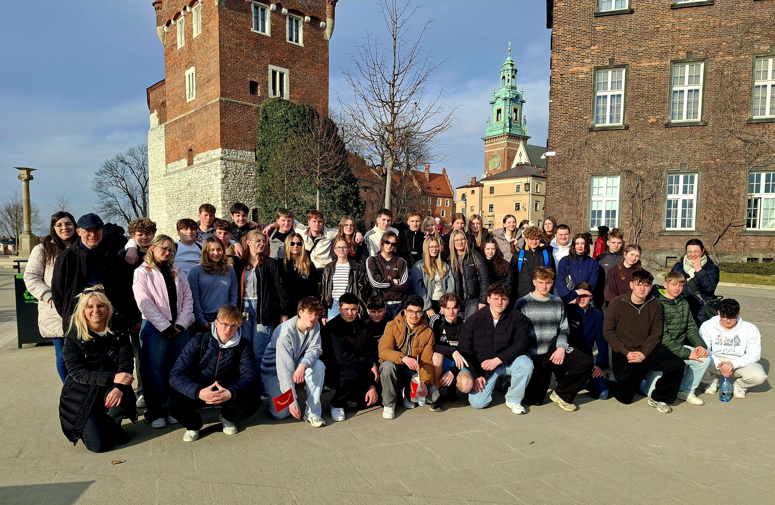Eine beeindruckende Studienfahrt führte 42 Schülerinnen und Schüler der Jahrgangsstufe 10 der KGS Kirchberg nach Krakau. Klassenübergreifend machten sich die Jugendlichen auf den Weg nach Polen, um sich vor Ort intensiv mit der Geschichte jüdischen Lebens in der Stadt vor 1939 und mit den Ereignissen infolge der nationalsozialistischen Besatzung auseinanderzusetzen. Während der mehrtägigen Fahrt beschäftigten sich die Schülerinnen und Schüler mit der Verfolgung der jüdischen Bevölkerung, der Ghettoisierung in Krakau sowie mit Deportationen und Massenmorden während der Zeit des Nationalsozialismus. Darüber hinaus bot die Reise auch Gelegenheit, das moderne Krakau zu erleben und Einblicke in die polnische Kultur zu gewinnen. Für verschiedene Orte in der Stadt hatten die Schüler Referate erarbeitet, die sie ihren Mitschülerinnen und Mitschülern direkt vor Ort präsentierten.