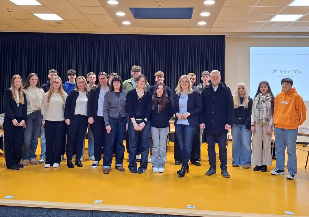 Pünktlich vor der heißen Phase des Landtagswahlkampfs fand Mitte Januar die jährliche Podiumsdiskussion der Landtagsabgeordneten an der KGS Kirchberg statt. Die inhaltliche Ausgestaltung lag in den Händen des Sozialkunde-Leistungskurses 11, moderiert wurde die Veranstaltung von den Schülerinnen Lia Meyer und Lina Kaiser. Sie begrüßten aus den verschiedenen Fraktionen Jutta Blatzheim-Rögler (Bündnis 90/ Die Grünen), Dr. Tamara Müller (SPD), Karina Wächter (CDU) und Ralf Schönborn (AfD).
